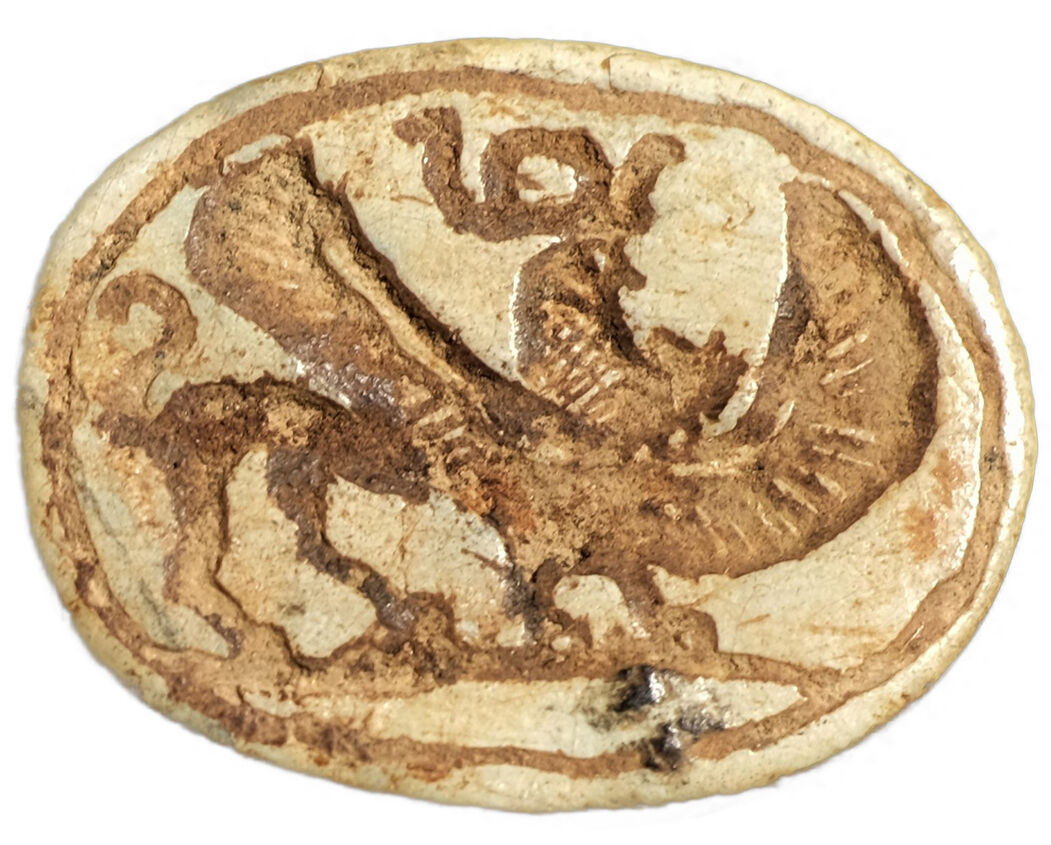 For example, we found very large cowrie shells. We have cowrie shells all through ancient history and prehistory. The small ones we have as jewelry. But in this tomb, they found 10 very large ones—as big as your fist. The only time we’ve been seeing these very large cowrie shells has been in temples of female deities. For example, in Petra, in the Temple of the Winged Lions, and in another temple that was discovered from the Roman period down in the Eastern Desert of Egypt along the Red Sea coast. Here we have them too, and again, there were a lot of trinkets as well. There were scarabs—some of them were Phoenician type and a very small number of ceramic vessels. They were very small and portable. One of the earliest ones we have is a cooking pot with a seal impression that had been pressed into the handle, which is found right at the end of the First Temple Period before the destruction of the temple in Jerusalem. It’s a Judean type.
