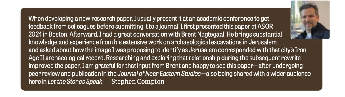 We were in Boston attending the 2024 American Schools of Overseas Research (asor) conference, where Compton was presenting his interpretation of Slab 28. Listening to him lay out his research, and discussing all the archaeological and historical connections, it was clear he was onto something. He might be right! I thought. This is the oldest work of art depicting Jerusalem ever found!