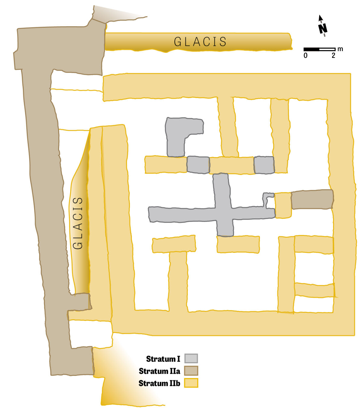 Sometime between the middle to second half of the 10th century b.c.e., construction began on the fortress, which heralded a new vision and large investment in the site. Excavators were able to divide the use of the fort into two phases: Stratum iib and iia (the names of these layers should not be confused with the archaeological periods Iron Age iia and iib—both phases of construction took place during Iron Age iia).