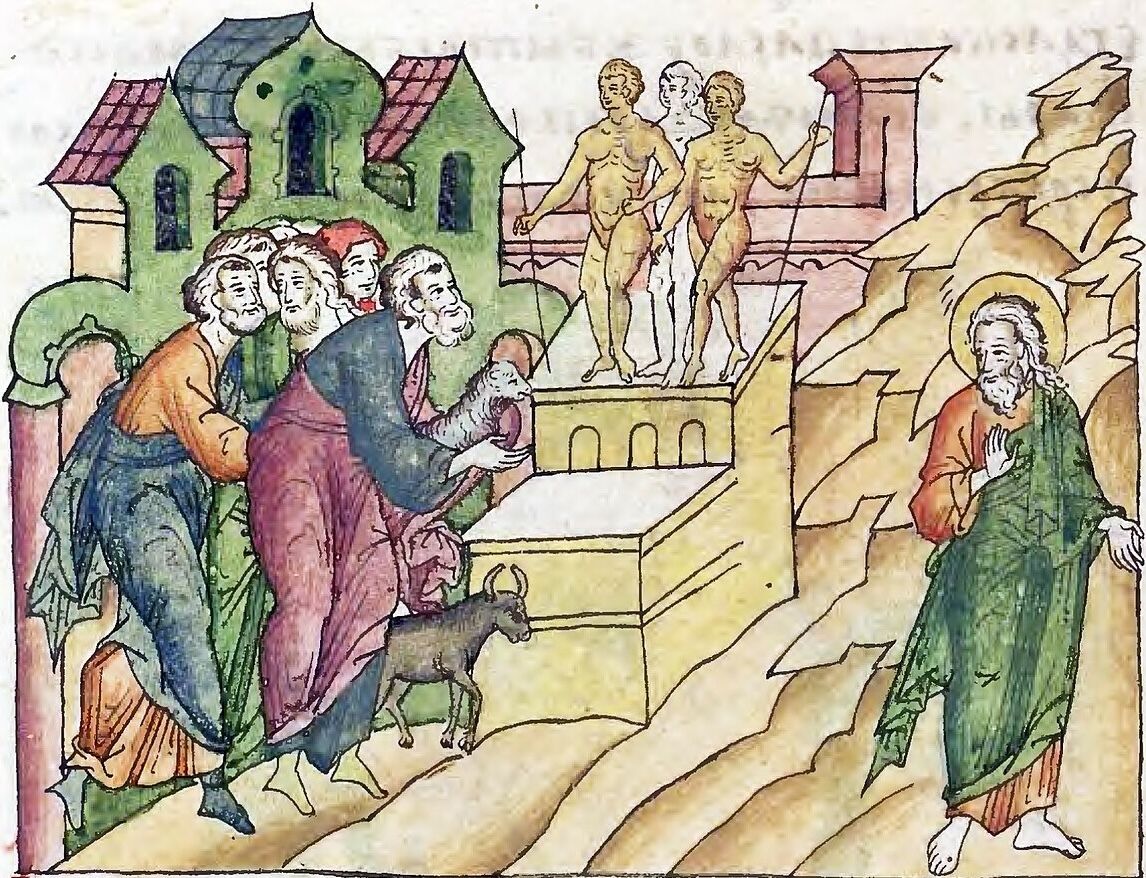 Terah with his idols, Abraham departing (Illustrated Chronicle of Ivan the Terrible, circa 1560)