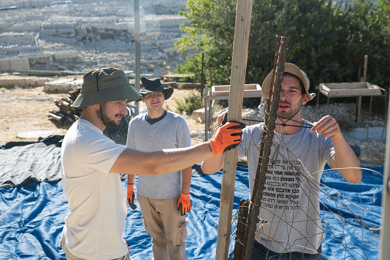 July 6 | Caleb and Amihai prepare to hoist shade over the pottery washing area as Shlomo, pottery-washing supervisor, looks on.