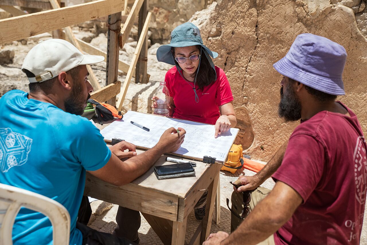 July 6 | Area D assistant supervisors Aviv and Shoham discuss the area with supervisor Amir Cohen-Klonymous.
