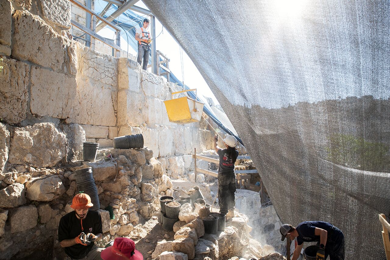 July 8 | Ava pulls the rope to guide the bucket away from the wall as Adam operates the crane to lift out a load of dirt and stones from Area D.
