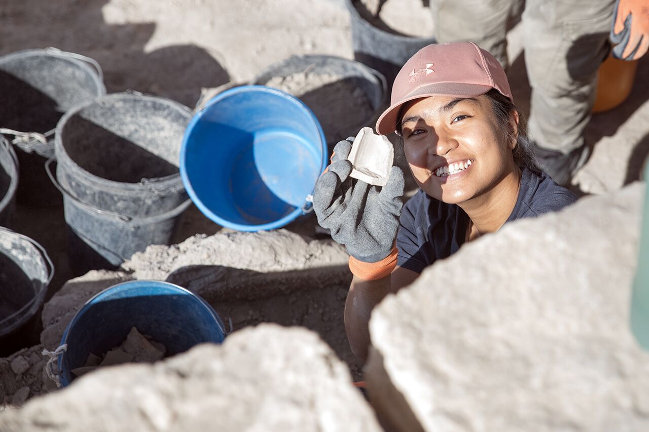 July 8 | Bea shows off a stone object she discovered in Area D1.
