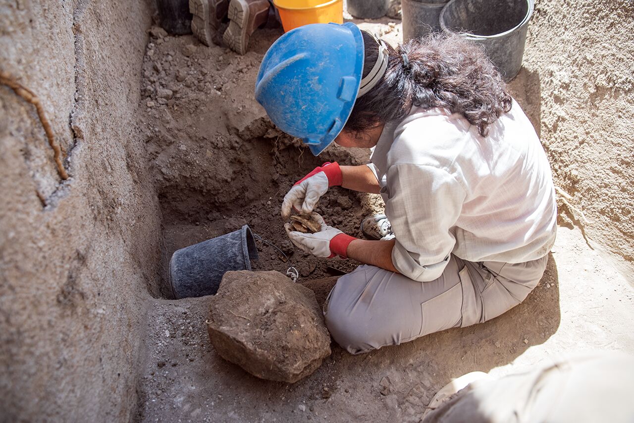July 13 | Michelle examines pottery she’s discovered in the mikveh she’s excavating in Area D1.