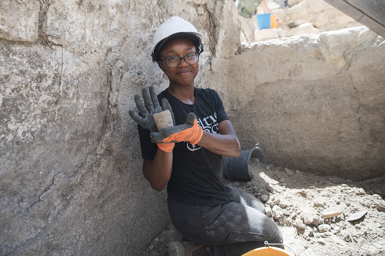 July 13 | Chioma holds up a stone object she discovered in the mikveh in Area D1.