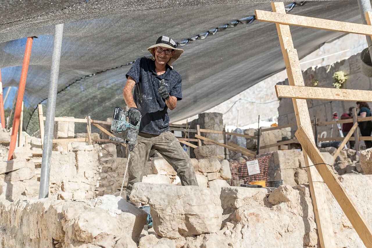 July 15 | Husam drills a hole through large rocks to stabilize a corner of Area D.