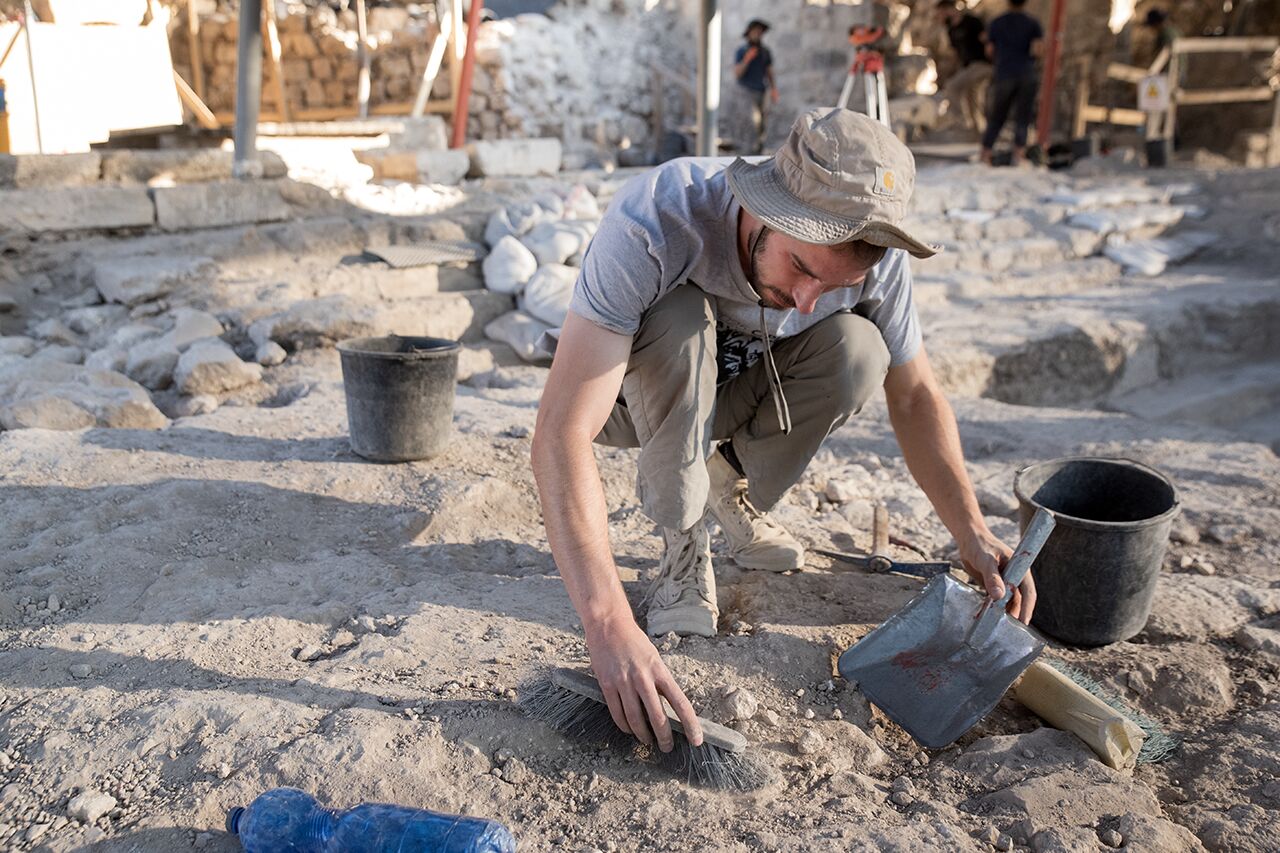 July 24 | Area P assistant supervisor Amihai removes the hard plaster between layers on the south side of the large mikveh.