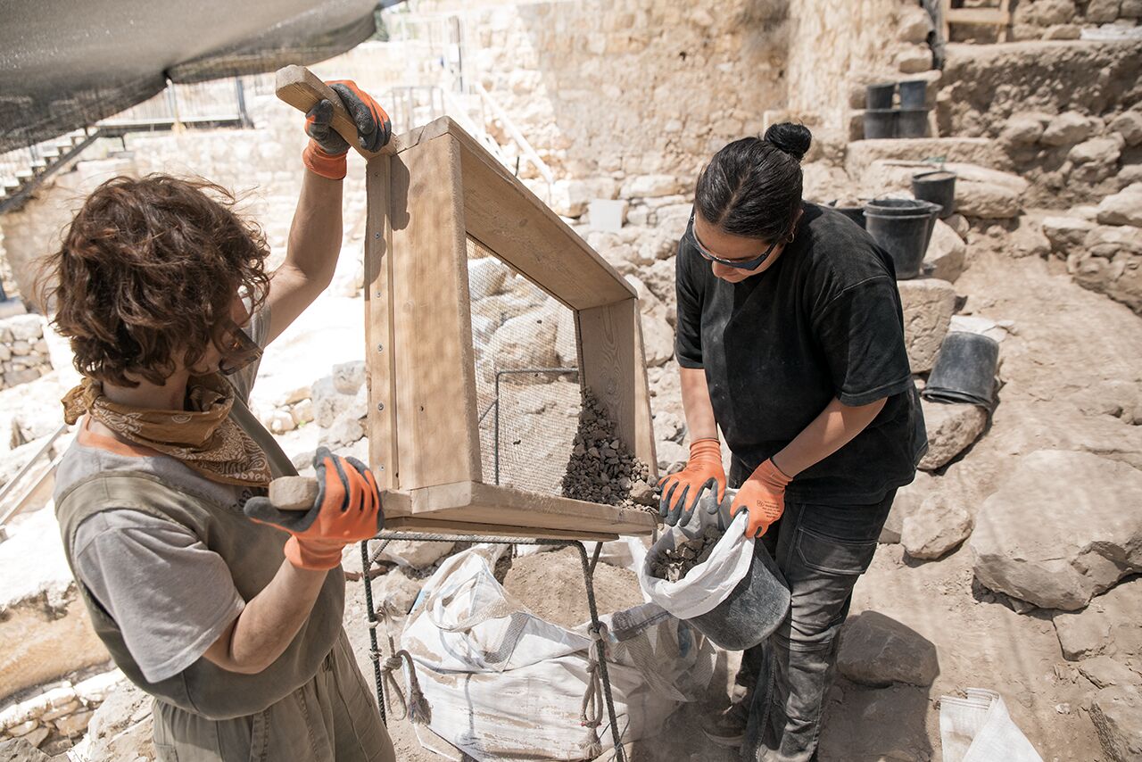 July 29 | Ita and Nigina dry-sift buckets of dirt pulled from the mikveh in Area D.